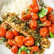 I love using rice as the base for this baked salmon recipe to absorb all the juicy and delicious flavors of the roasted cherry tomatoes and onions, and when paired with pesto salmon, it takes the otherwise bland ingredient to the next level.