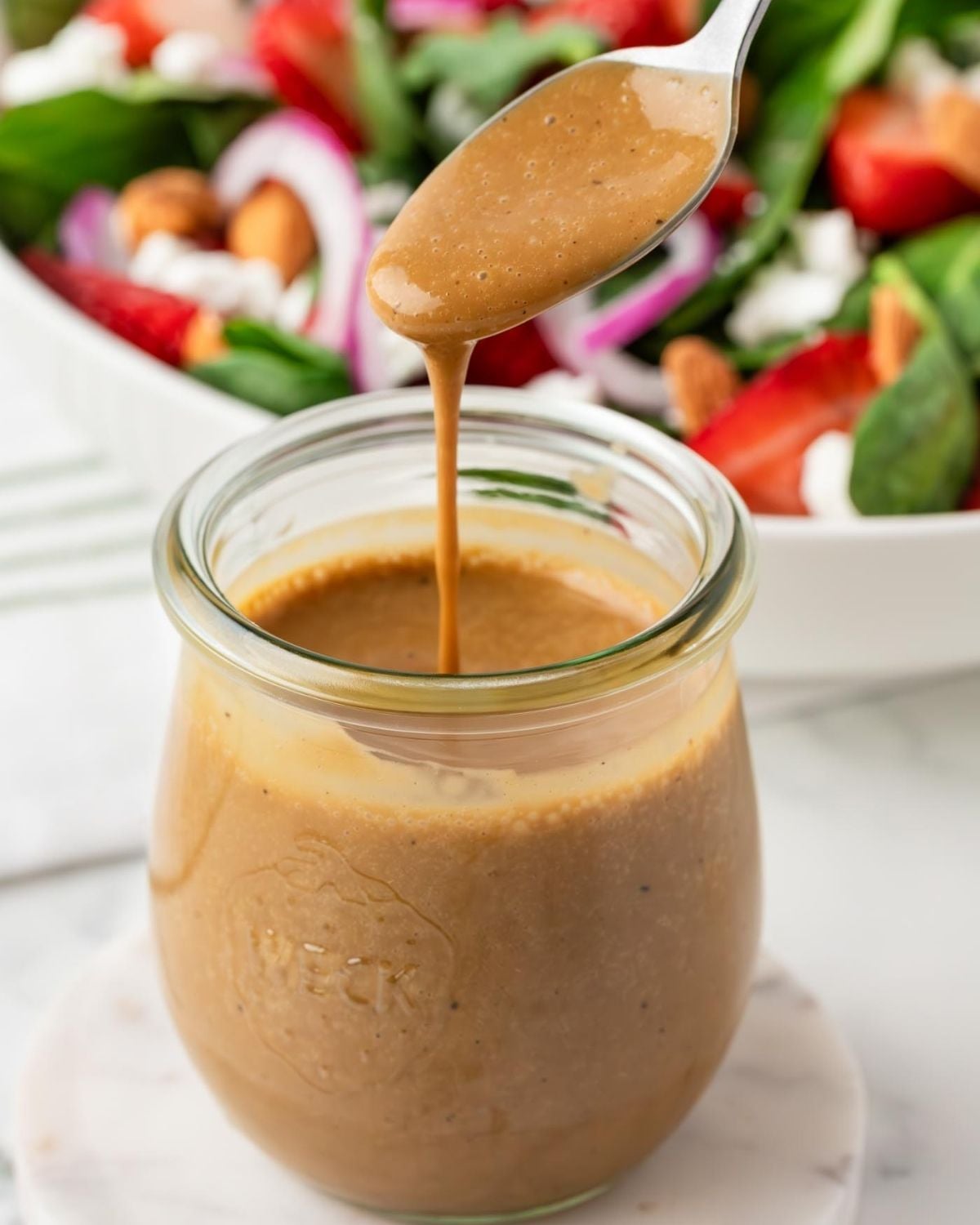 - Dijon mustard: adds flavor and helps emulsify, keeping the dressing smooth and combined instead of separating.