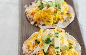 Tortillas are served with scrambled eggs (or fried eggs, why not?) and other staples like bacon, sausage, avocado, salsa, or beans.