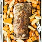 A juicy pork loin roast surrounded by sweet potatoes, carrots, and apples is a mouthwatering sweet-and-sour combo that will have everyone asking for seconds. The best part: this beauty comes together super fast and then you just let it bake.