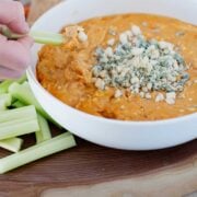 This hummus-based buffalo chicken dip was amazing! We thought it tasted best with celery, and it was also great with crackers, on tortilla chips, and as a sandwich topping. It’s got just the right amount of heat, a great texture, and rich flavor. I’ll definitely be making it again.