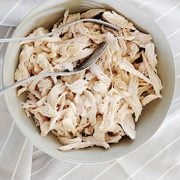 Note: make sure to work with room-temperature chicken. If it’s too hot, you’ll burn your hands, and if it’s too cold, the meat is tougher to shred.