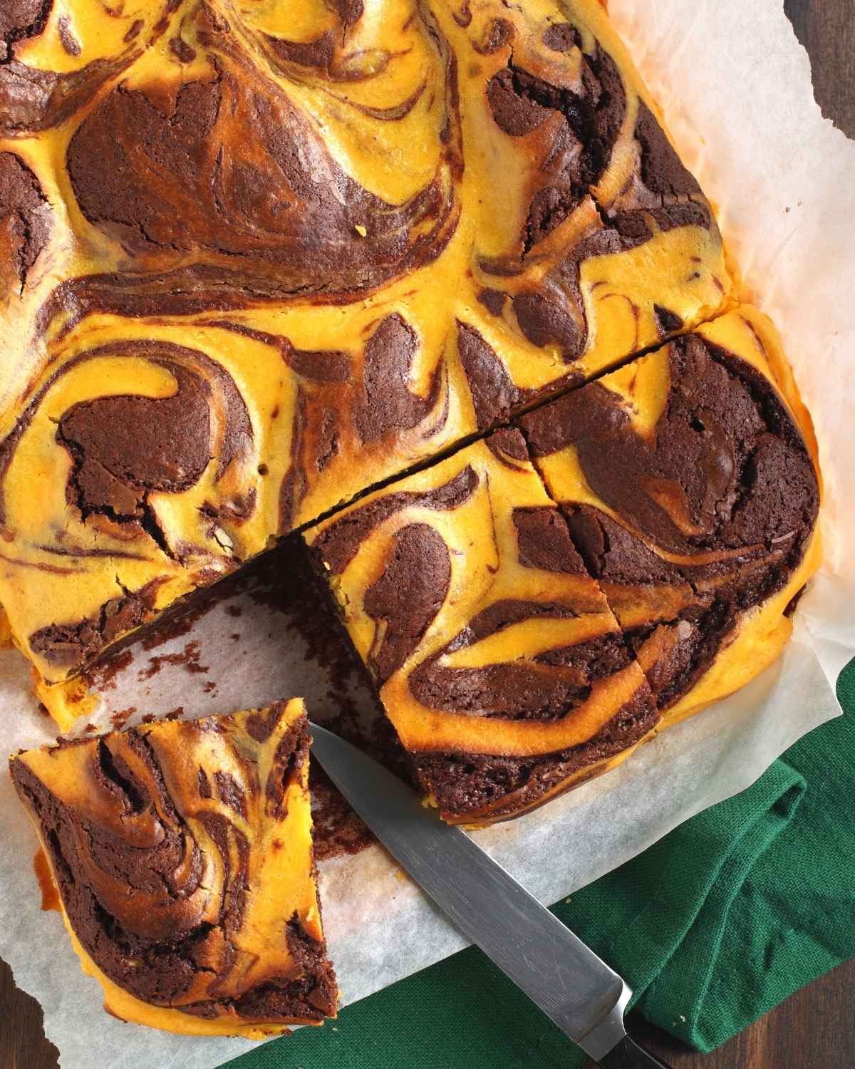 For a great swirl, divide the base batter in half. Mix the chocolate into one bowl and the pumpkin into the other. Spread the chocolate layer into the pan first, then spoon the pumpkin batter on top and gently drag a knife through both layers to create those pretty swirls without overmixing.