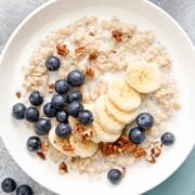 There are no rules when it comes to loading up your bowl of quick oats with oatmeal toppings! My go-to’s are freshly sliced bananas, berries, a pinch of cinnamon, or a dollop of Greek yogurt.