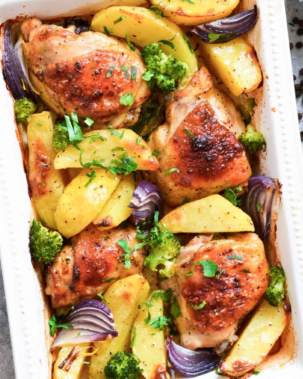 Here is the process and useful tips for making juicy roasted chicken pieces with golden and tender potatoes quick and easy: