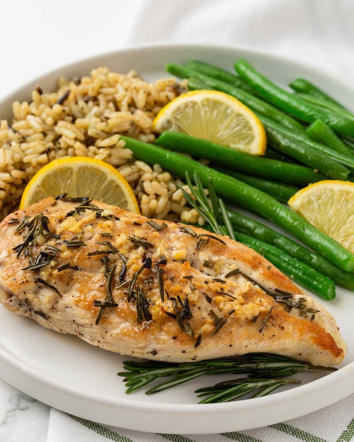 Boneless, skinless chicken breasts are the hero of this recipe. In the oven, they get all the flavors of olive oil, garlic (cloves or powder), fresh rosemary (or dried), a little butter, garlic, and lemon. Adding a little chicken broth (or water) to the baking dish creates a herby sauce.
