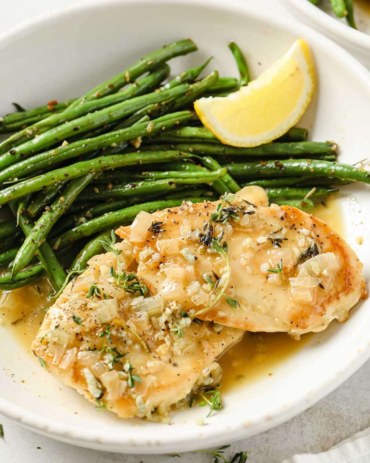 For cooking the chicken breasts, you’ll need salt, pepper, and flour. For the sauce, you’ll use butter, onion, garlic cloves, store-bought or homemade chicken broth, white wine, cornstarch, and fresh or dried thyme (or poultry seasoning). The green beans will also be seasoned with Italian seasoning, red pepper flakes (optional), and lemon.