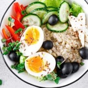 Divide the oatmeal between 4 bowls, and top each with a halved soft-boiled egg, feta cheese, olives, and sliced veggies.